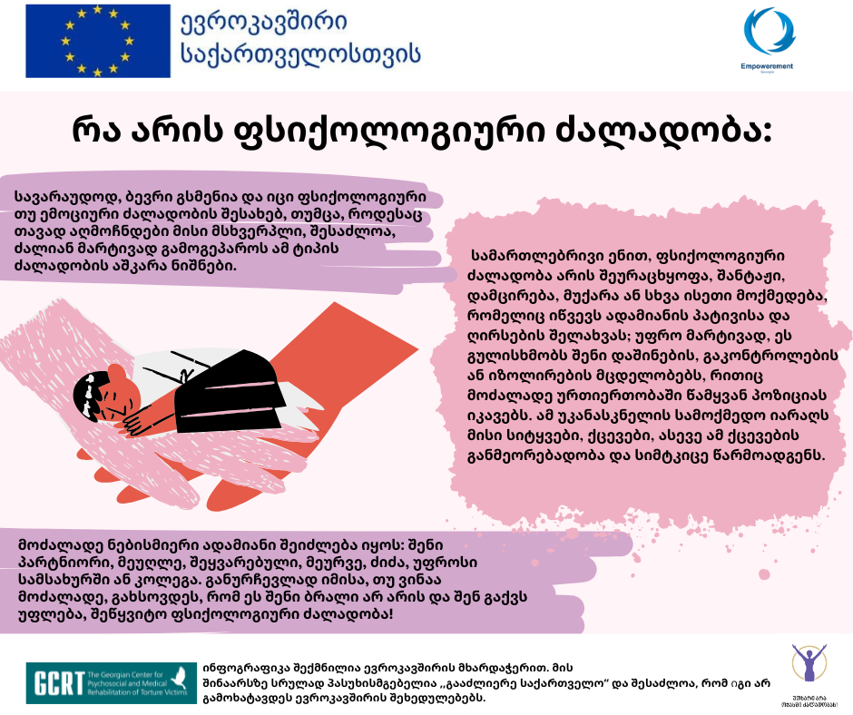 პროექტის ფარგლებში – ‘’ქალთა მიმართ ძალადობის პრევენცია“ , მომზადდა პოსტერი თემაზე ,,რა არის ფსიქოლოგიური ძალადობა“.