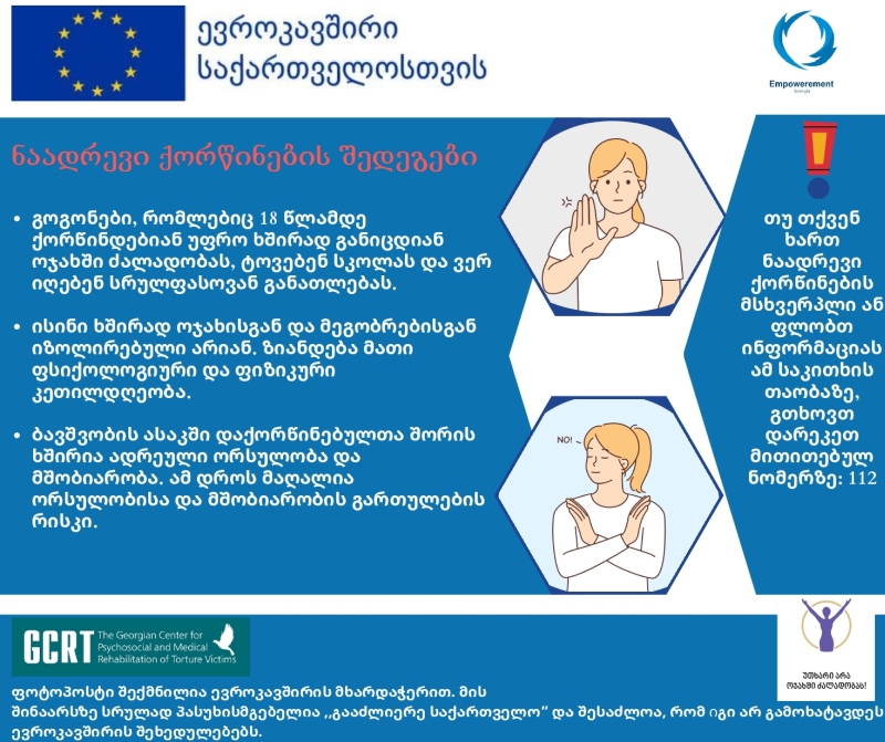 პროექტის ფარგლებში – ‘’ქალთა მიმართ ძალადობის პრევენცია“ , მომზადდა პოსტერი თემაზე ,,ნაადრევი ქორწინების შედეგები“.