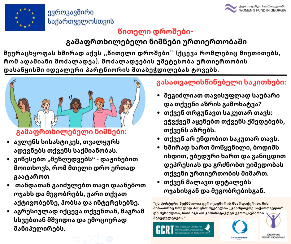პროექტის ფარგლებში – ‘’ქალთა მიმართ ძალადობის პრევენცია“ , მომზადდა ინფოგრაფიკა თემაზე ,,წითელი დროშები- გამაფრთხილებელი ნიშნები ურთიერთობაში“.