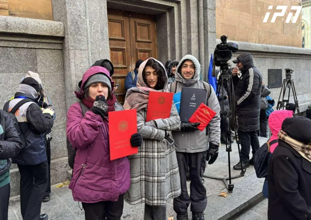 საქართველოს პარლამენტთან აქცია სახელწოდებით: „ვაჩვენოთ დიპლომი ყაველაშვილს“ მიმდინარეობს. შესაბამისად, მომიტინგეებმა საკანონმდებლო ორგანოსთან საკუთარი დიპლომები მიიტანეს.