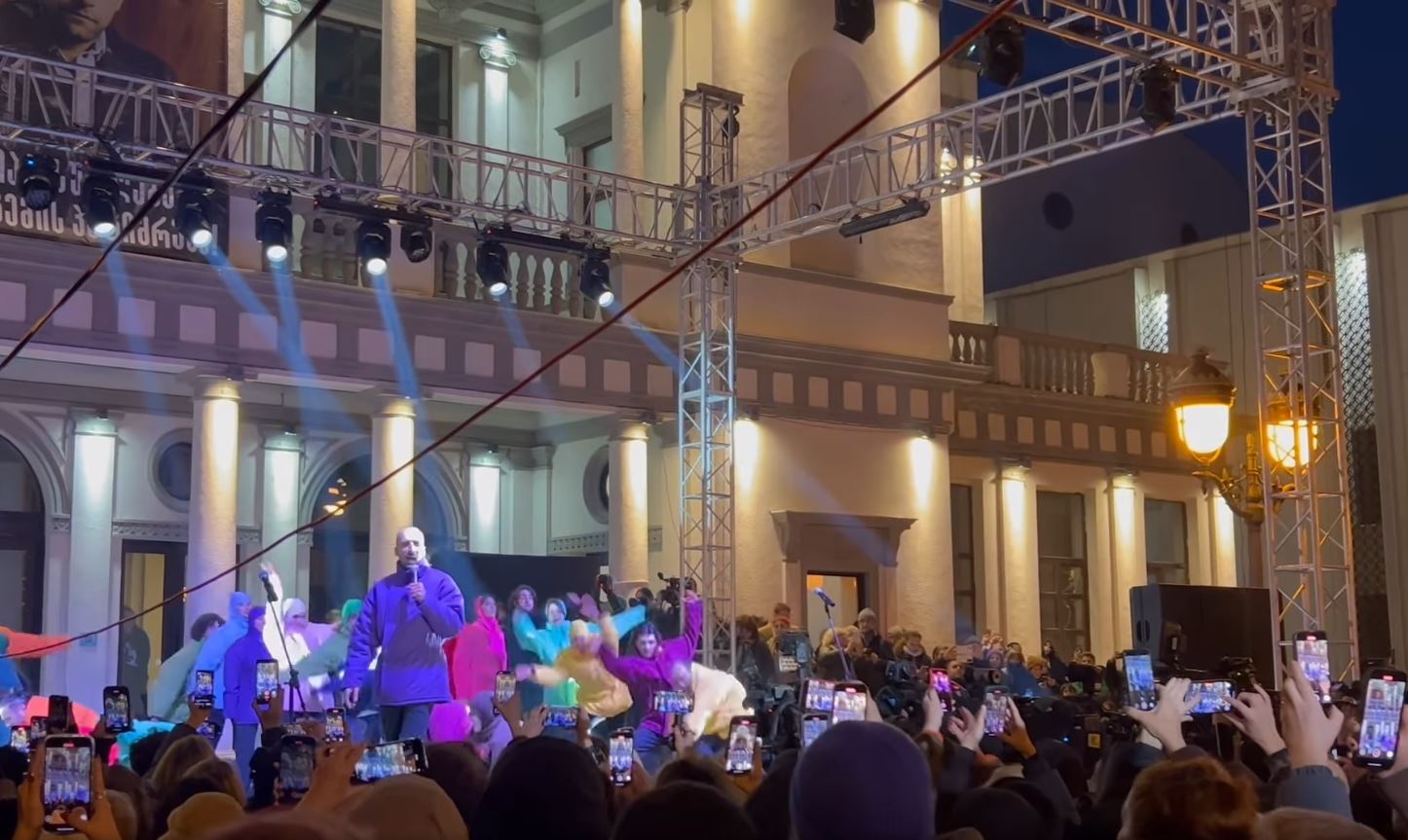 დააბნელეს ყველაფერი. კიდევ ერთხელ გეუბნებით, რაც არ უნდა დააბნელოთ მთელი ქალაქი, სცენაზე შუქი აინთება და იქ ჩვენ ვიქნებით და ჩვენ გავიმარჯვებთ. ჩვენ ვიწყებთ ახალი თეატრის მანიფესტს. ეს ჩვენი ბრძოლა იყო და ამიტომ ვიწყებთ დღეს ჩვენ, მაგრამ ჩვენი მეგობრები, სხვა თეატრები, ყველა აუცილებლად შემოგვიერთდება. აქვე, ვიწყებ დაანონსებას – „ახალი თეატრი“ გადის რეგიონებში – ყველგან მივალთ და ყველასთან დავილაპარაკებთ და თქვენ აუცილებლად ნახავთ, რა შეუძლია თეატრს. შემოგვიერთდება ყველა. ჩვენ აუცილებლად გავიშლებით მთელს რეგიონებში. სდიეთ ქართულ თეატრს, სდიეთ!