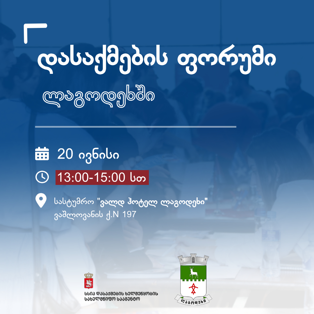 ,,გამოიყენე შანსი გაიცნო კომპანიის წარმომადგენლები პირადად; წარადგინო შენი თავი და შესაძლებლობები; გაეცნო ადგილობრივ ვაკანსიებს; გაიარო გასაუბრება და მარტივად დასაქმდე შენთვის საინტერესო პოზიციაზე. ფორუმი ჩატარდება ქალაქ ლაგოდეხში, სასტუმროში ,,Wald Hotel Lagodekhi’’ 13:00-დან 15:00 საათამდე. ფორუმის მიზანია ხელი შეუწყოს ადგილობრივი კომპანიებისთვის კვალიფიციური კადრების მოძიებას და ლაგოდეხის მუნიციპალიტეტის მოსახლეობისთვის დასაქმებაში ხელშეწყობას. ღონისძიება იმართება დასაქმების ხელშეწყობის სახელმწიფო სააგენტოსა და ლაგოდეხის მუნიციპალიტეტის ინიციატივითა და თანამშრომლობით”,-აცხადებენ დასაქმების ხელშეწყობის სახელმწიფო სააგენტოში.