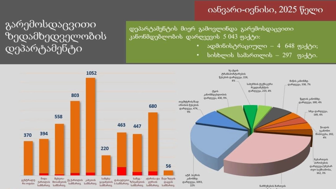 გარემოს დაცვისა და სოფლის მეურნეობის სამინისტროს გარემოსდაცვითი ზედამხედველობის დეპარტამენტის თანამშრომლებმა, 2025 წლის 1 იანვრიდან 30 ივნისის ჩათვლით, 5043 გარემოსდაცვითი სამართალდარღვევა გამოავლინეს. მათგან 297 ფაქტი სისხლის სამართლის დანაშაულის ნიშნებს შეიცავს და მასალები, შემდგომი რეაგირების მიზნით, შესაბამის უწყებებში გადაიგზავნა.