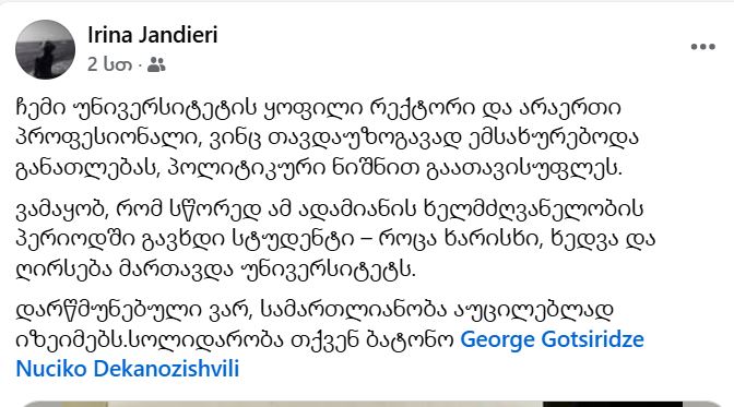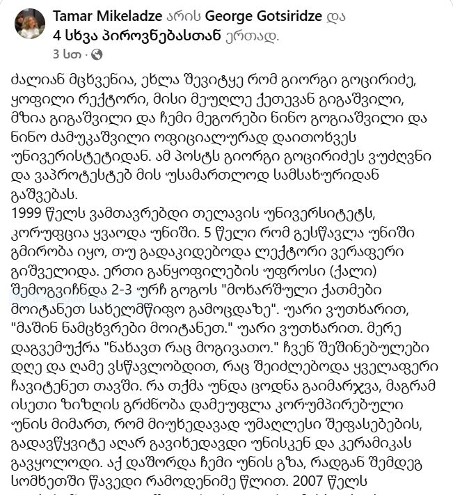მასშტაბური გათავისუფლება 11 წლის წინ 2014 წლის 1 სექტემბერსაც განხორციელდა, მაშინდელი ადმინისტრაციის ხელმძღვანელის, პაატა გოცირიძის ბრძანებით, თელავის სახელმწიფო უნივერსიტეტის 24 თანამშრომელს შრომითი ხელშეკრულება აღარ გაუგრძელდა.