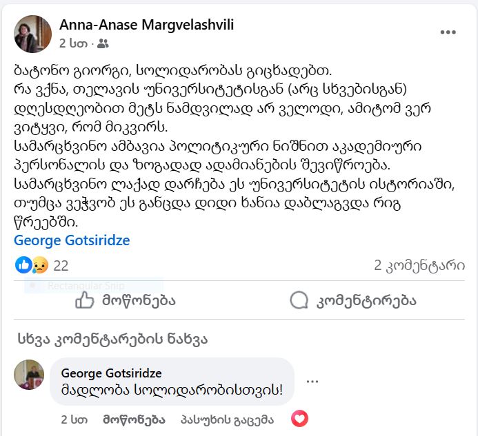 უნივერსიტეტში მიღებულ ამ გადაწყვეტილებას საზოგადოების ნაწილი პოლიტიკური ნიშნით გათავისუფლებას უკავშირებს, რადგან სამსახურის გარეშე დარჩენილი პროფესორები, საქართველოში მიმდინარე პროევროპული აქციების აქტიური მხარდამჭერები არიან. პროფესორებისა და სტუდენტების ნაწილი საპროტესტო განცხადებებს აკეთებდნენ: https://knews.ge/?p=106554