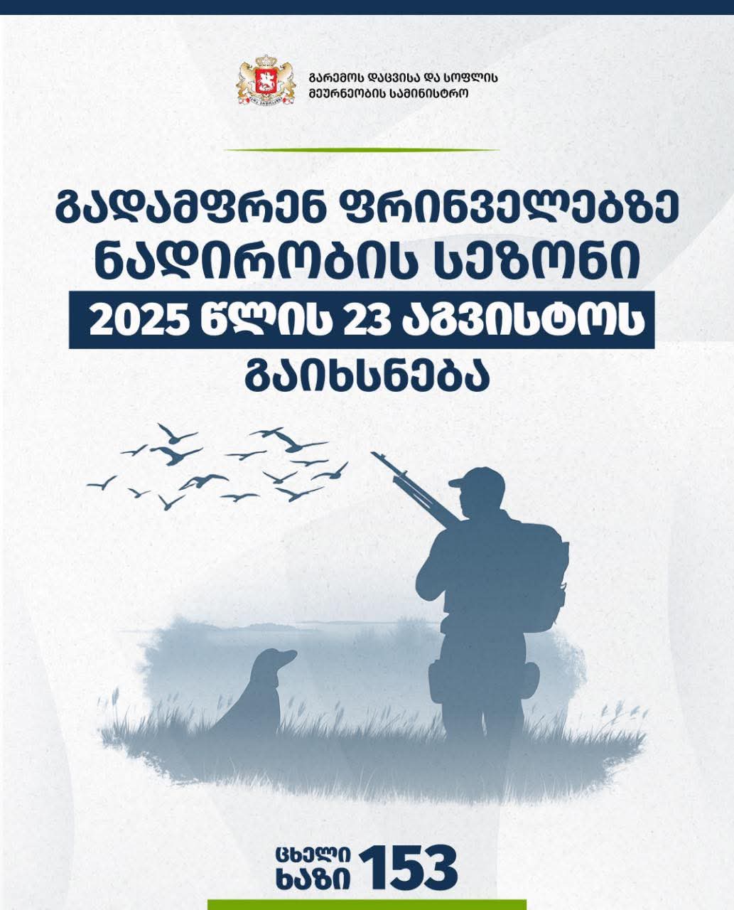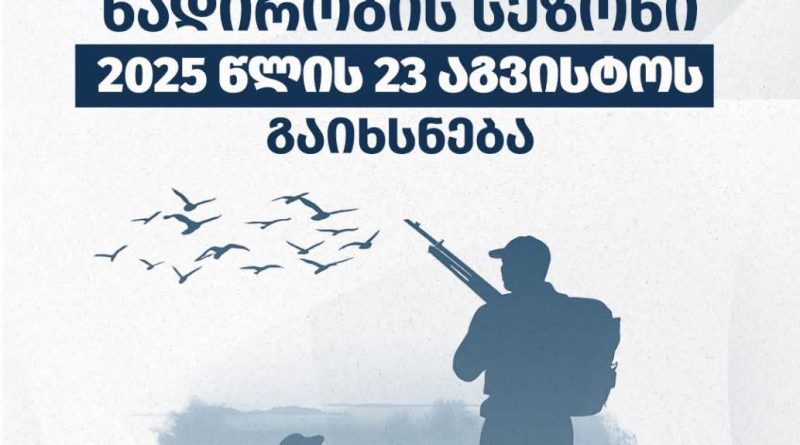 საქართველოს გარემოს დაცვისა და სოფლის მეურნეობის სამინისტრო „ცხოველთა სამყაროს ობიექტების, მათი სახეობების მიხედვით მოპყრობის წესების, ვადებისა და მოპოვებისთვის დაშვებული იარაღისა და მოწყობილობების ჩამონათვალის შესახებ დამტკიცების თაობაზე“ ბრძანების შესაბამისად, ნადირობის სეზონს 2025 წლის აგვისტოს მეოთხე შაბათს (23 აგვისტო) გახსნის.