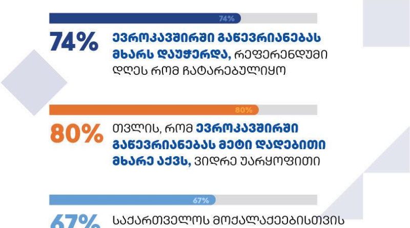კვლევის მიხედვით დღეს რომ რეფერენდუმი ჩატარდეს, 74% მხარს დაუჭერდა ევროკავშირში გაწევრიანებას, ხოლო 80% მიიჩნევს, რომ ეს ქვეყანას მეტ სარგებელს მოუტანს, ვიდრე ზიანს. ევროკავშირი რჩება საქართველოს ყველაზე სანდო საერთაშორისო პარტნიორად, მას ენდობა მოქალაქეების 67%. ევროკავშირის მხარდაჭერის შესახებ ცნობადობა კვლავ მაღალია და 70%-ს აღემატება.