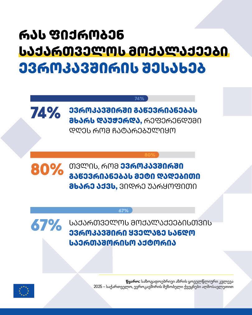 2025 წლის ყოველწლიური კვლევა კიდევ ერთხელ ადასტურებს რომ საქართველოს მოქალაქეების უმრავლესობა საკუთარ მომავალს ევროკავშირში ხედავს.