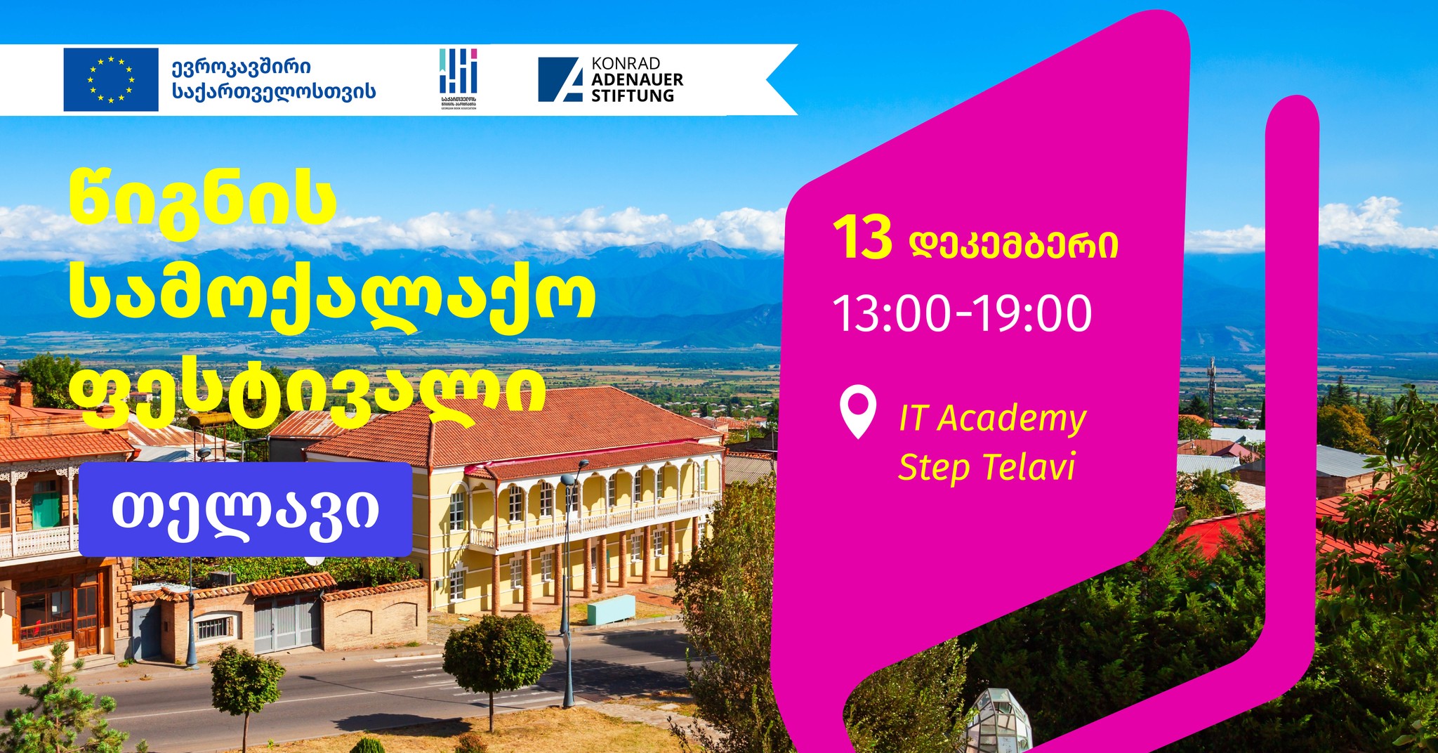 წიგნის სამოქალაქო ფესტივალი ქალაქ თელავში, IT აკადემია STEP-ის საერთაშორისო ტრანსფორმაციული განათლების ცენტრში (ი.ჭავჭავაძის მოედ. #4), 13 დეკემბერს, 13:00-დან 19:00 საათამდე გაიმართება.