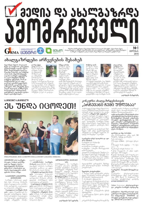 საარჩევნო ჩანართები რეგიონული მედიის ასოციაციის (GRMA) მიერ მიმდინარე პროექტის ფარგლებში გამოიცა, რომელიც მიზნად ისახავს ახალგაზრდა ამომრჩევლის ინფორმირებას და საქართველოს 8 რეგიონში მიმდინარეობს.