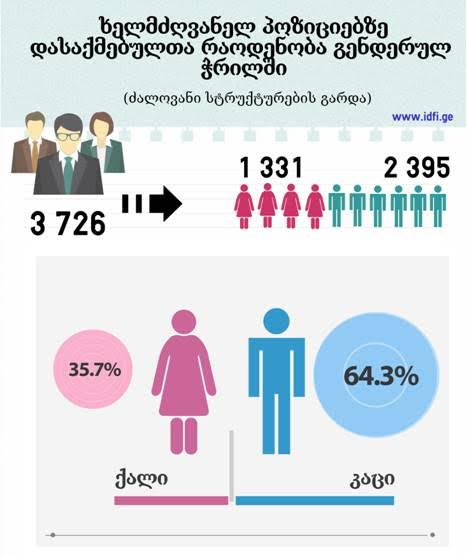 ინფორმაციის თავისუფლების განვითარების ინსტიტუტის (IDFI) კვლევის შედეგებით დასტურდება, რომ საჯარო დაწესებულებში ქალთა და მამაკაცთა დასაქმების მაჩვენებელი თანაბარია, თუმცა ხელმძღვანელ პოსტებზე ეს ბალანსი მნიშვნელოვნად დარღვეულია. მამაკაცთა წარმომადგენლობა გაცილებთ მაღალია, ვიდრე ქალების. კერძოდ, მთავრობის ადმინისტრაციასა სამინისტროებში, საჯარო ხელმძღვანელ პოზიციებზე დასაქმებულთაგან, ქალი მხოლოდ 35%-ია. პარლამენტში 12%, ხოლო ადგილობრივი თვითმმართველობის დონეზე მათი მონაწილეობა კიდევ უფრო მცირე.