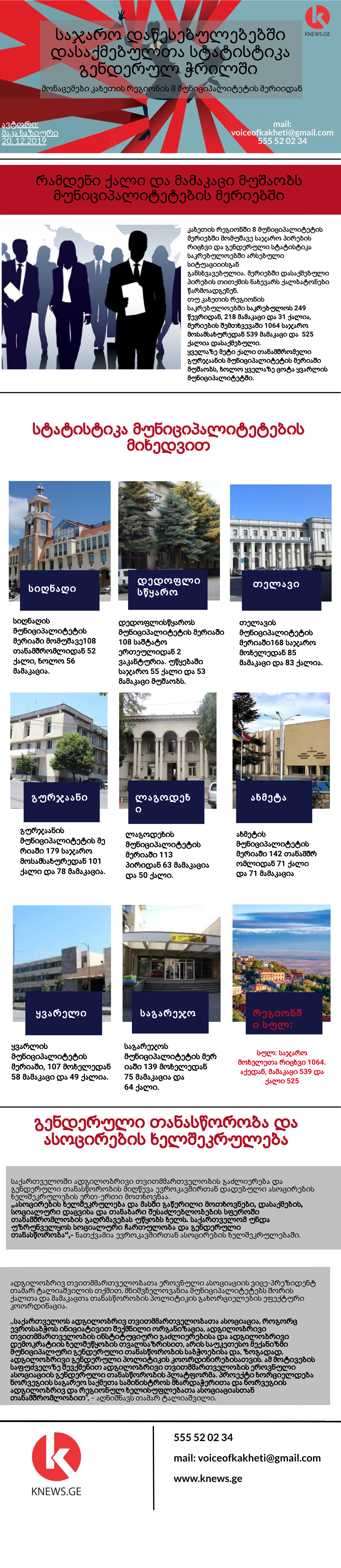 თუ კახეთის რეგიონის საკრებულოებში საკრებულოს 249 წევრიდან, 218 მამაკაცი და 31 ქალია, მერიების შემთხვევაში 1064 საჯარო მოსამსახურედან 539 მამაკაცი და 525 ქალია დასაქმებული.
