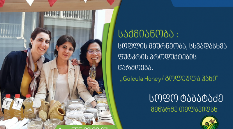 თელავის მუნიციპალიტეტის სოფელ კისისხევში მცხოვრები მეწარმე სოფო ტაბატაძე, თაფლს, ფუტკრის პროდუქტებს, ხელნაკეთ ნივთებს და სოფლის მეურნეობის პროდუქტებს აწარმოებს.