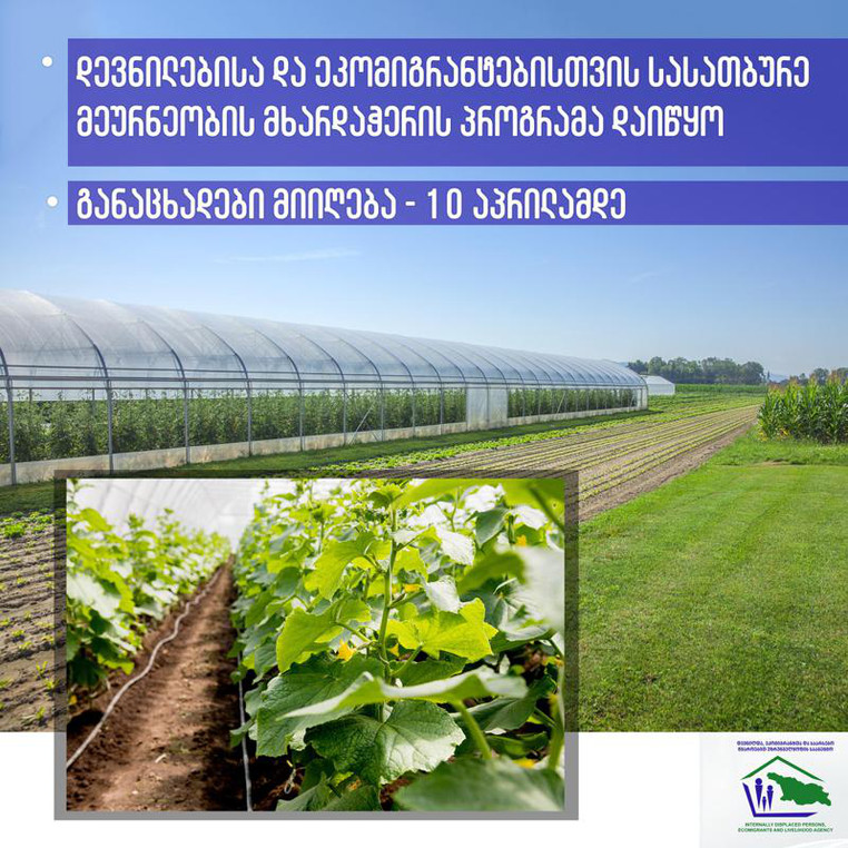დევნილთა, ეკომიგრანტთა და საარსებო წყაროებით უზრუნველყოფის სააგენტომ „სასათბურე მეურნეობის მხარდაჭერის საგრანტო პროგრამის“ ფარგლებში, იძულებით გადაადგილებული პირების განაცხადების მიღება დაიწყო.