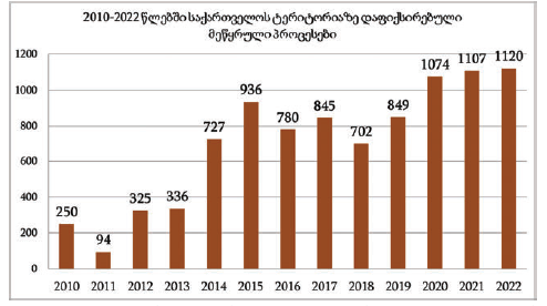 გარდა ამისა, ბიულეტენში აღწერილია 2010- 2022 წლებში მომხდარი მეწყრული პროცესების რაოდენობა. დიაგრამის მიხედვით, 2022 წელს საქართველოს მთელს ტერიტორიაზე დაფიქსირდა 1120 მეწყრული პროცესი, ეს მაშინ როდესაც, 2010 წელს 250 იყო.